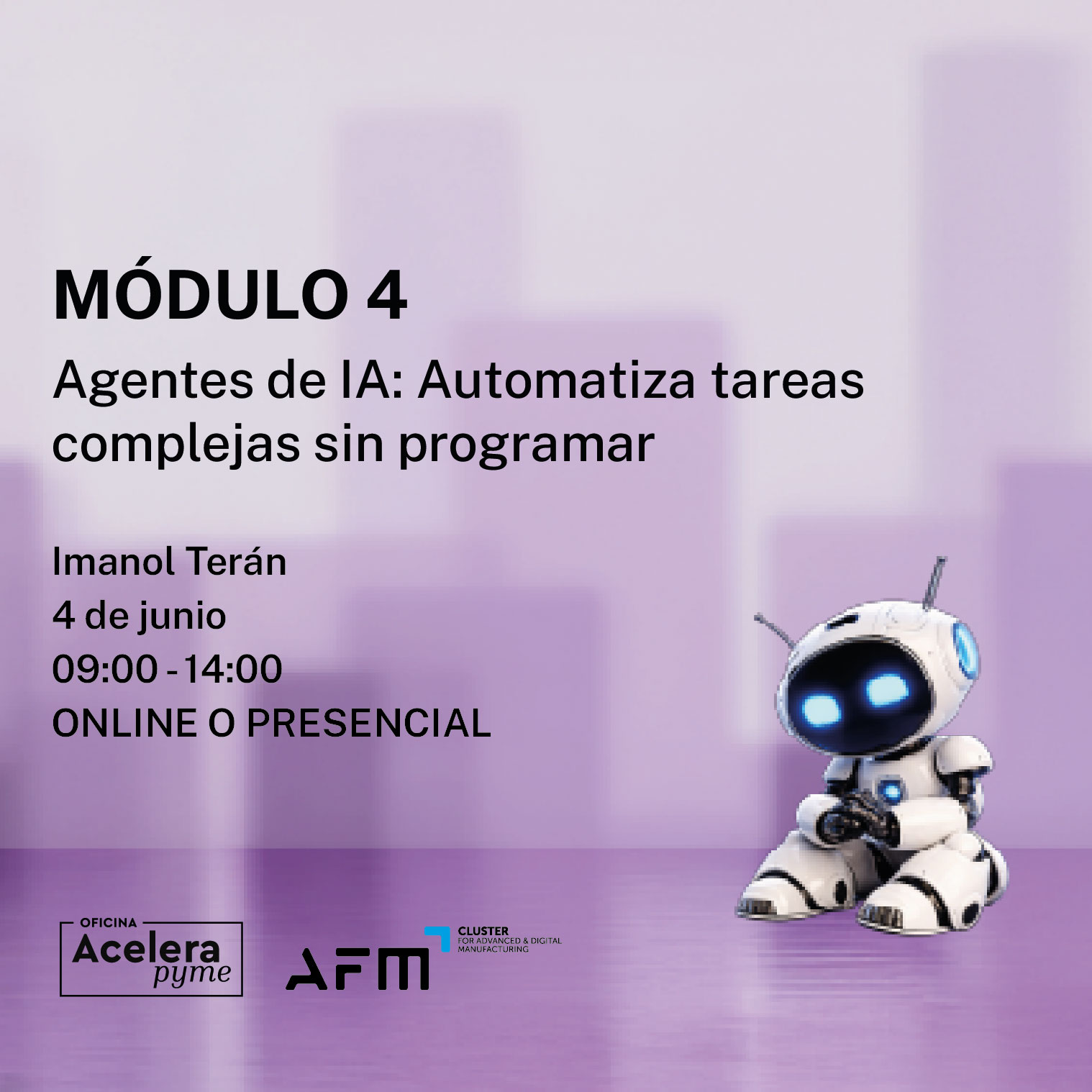 Este módulo introduce qué es un agente de IA y en qué se diferencia de un chatbot. Se aborda la creación de asistentes personalizados para automatizar tareas sin necesidad de programar, aplicados a ámbitos como la atención al cliente, la generación de ofertas, la documentación técnica o el soporte interno.